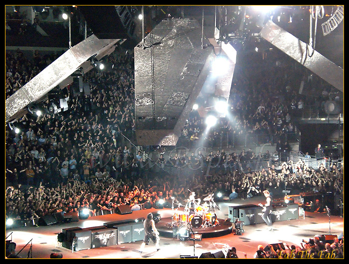« Turn the page » jouée peu après est par contre l’une des deux déceptions de la set-list. Pour un live, étant donné l’omniprésence du dernier album (pour mon plus grand plaisir ceci dit), pourquoi nous placer des reprises, et pas les meilleures en plus ? Néanmoins, les titres de Death Magnetic s’enchaînent, Robse permet même de descendre (3 minutes) au niveau du public (ah…nostalgie du « Load » tour, avec cette double-scène centrale). |